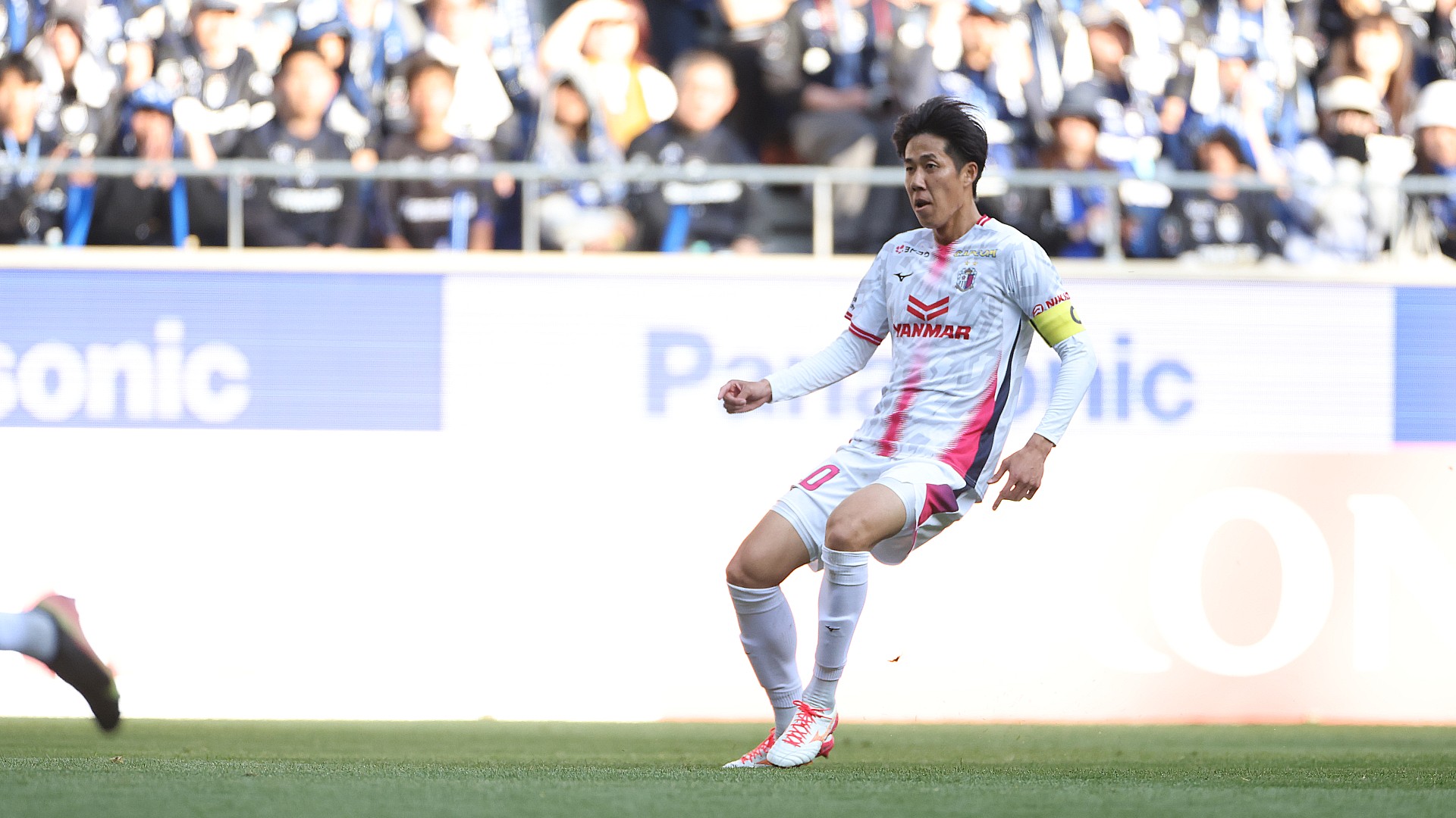 今節は普段とは異なる配置でスタート。チアゴ アンドラーデが1トップ、中島がトップ下、右ウイングに柴山昌也、左ウイングに阪田澪哉。「9番のポジションは初めて」と話すチアゴにこの位置での先発を伝えたのは「試合前日」とアーサー パパス監督。「ダブル10番」(パパス監督)を採用した前々節・ヴィッセル神戸に続き新たなトライを行った。「良い方に転ぶと思っていました。チアゴが真ん中にいれば、右でも左でも背後を取れるので、チームとしてアドバンテージになる」と試合後に話したのは田中駿汰だが、新布陣は開始から機能。4分、スローインを受けた柴山が右サイドからカットインしてファーストシュートを放つと、5分には石渡ネルソンが高い位置で奪ってショートカウンター。柴山のラストパスを受けたチアゴが決定機を迎えたが、シュートは枠を外れた。10分にもネルソンが中盤でボールを奪取。そこからチアゴ、中島、阪田とつなぎ、最後は中島が強烈なミドルシュートを放つ。試合前日、「腰が引けた戦いはしない」と明言していたパパス監督だが、特に「最初の15分は強度高く、アグレッシブに入ること」を選手たちと共有。試合の主導権を握ることに成功した。この試合のセレッソは下からつなぐ姿勢が明確。右サイドから中に絞った柴山や中島、田中駿やネルソンらがパスを受け、中盤で数的優位を作って相手を引き出すと、チアゴと阪田が背後を狙い、速い攻撃を仕掛けていく。24分にもチャンス。柴山のパスから左サイドの裏を取った大畑歩夢がクロス。受けた中島が切れ込みシュートを狙ったが、惜しくも体勢が崩れて打ち切れなかった。守備では自分たちがプレスを掛けることで相手にロングボールを蹴らせて回収。前半の終盤までは相手のシュートをゼロに抑えた。ただし、試合のリズムを掴んでいた前半だが、38分、中央でのパスがずれ、ガンバにショートカウンターを許すと最後はウェルトンに決定的なシュートを打たれたが、GK中村航輔が右足でビッグセーブ。続く40分にもピンチを招いたが、デニス ヒュメットのシュートは大畑が体を投げ出してブロック。すると、この流れからセレッソが先制に成功。大畑がブロックしてこぼれたボールを拾った岸本武流のクロスがファーに流れると、奥田勇斗、柴山、井上黎生人、奥田、柴山とつないで右サイドを突破。柴山の前方のパスに走り込んだ中島がヒールで落とすと、受けた田中駿が狙いすましたスルーパスを前方へ送る。「ワンタッチで打てるように」(田中駿)というメッセージが込められたパスに走り込んだチアゴがダイレクトでシュート。GK東口順昭の股を抜いてネットに突き刺した。“9番・チアゴ”が歓喜の先制点をもたらすと、43分にも疑似カウンターからチャンス。チアゴの落としを受けた中島が左サイドのスペースへ絶妙なパスを送る。ただし、スペースへ走った阪田が途中で太腿裏を痛めてピッチに倒れ込むアクシデント。結局、阪田はプレー続行不可能となり、横山夢樹が入り、前半は終了した。.jpg)