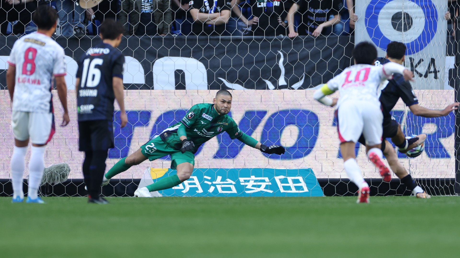 攻守に意思統一された素晴らしい前半を過ごした一方、後半は立ち上がりからガンバのペースで試合は進む。選手交代で中盤の強度を高めたガンバは68分、後半から入った安部柊斗のパスに、こちらも後半から入った南野遥海が背後へ抜け出すと、井上が南野を倒してPKを献上。後半の入りを踏まえると、セレッソとしてはここで追い付かれたら一気に流れを持って行かれかねない場面だったが、デニス ヒュメットのシュートは中村航がストップ。前にこぼれたボールを相手に拾われ、安部に押し込まれたが、VARの結果、オフサイドと判定されて得点は認められず。セレッソとしては胸をなでおろす結果となった。84分にもサイドを突破されてガンバに決定機を作られたが、最後のシュートは井上がブロック。こぼれ球に反応した中村航も体を張って守った。86分には櫻川と上門が入り、最前線で櫻川がキープして時間を作る。復帰戦となった上門も攻守にハードワークを惜しまず、上手く試合に入った。後半は決定機こそ作れなかったセレッソだが、ガンバにも得点を許すことなく試合終了。13分という長い後半アディショナルタイムでは田中駿を後ろに下げる5バックで耐えて、1-0で勝利。見事、開幕戦のリベンジを果たした。.jpg)