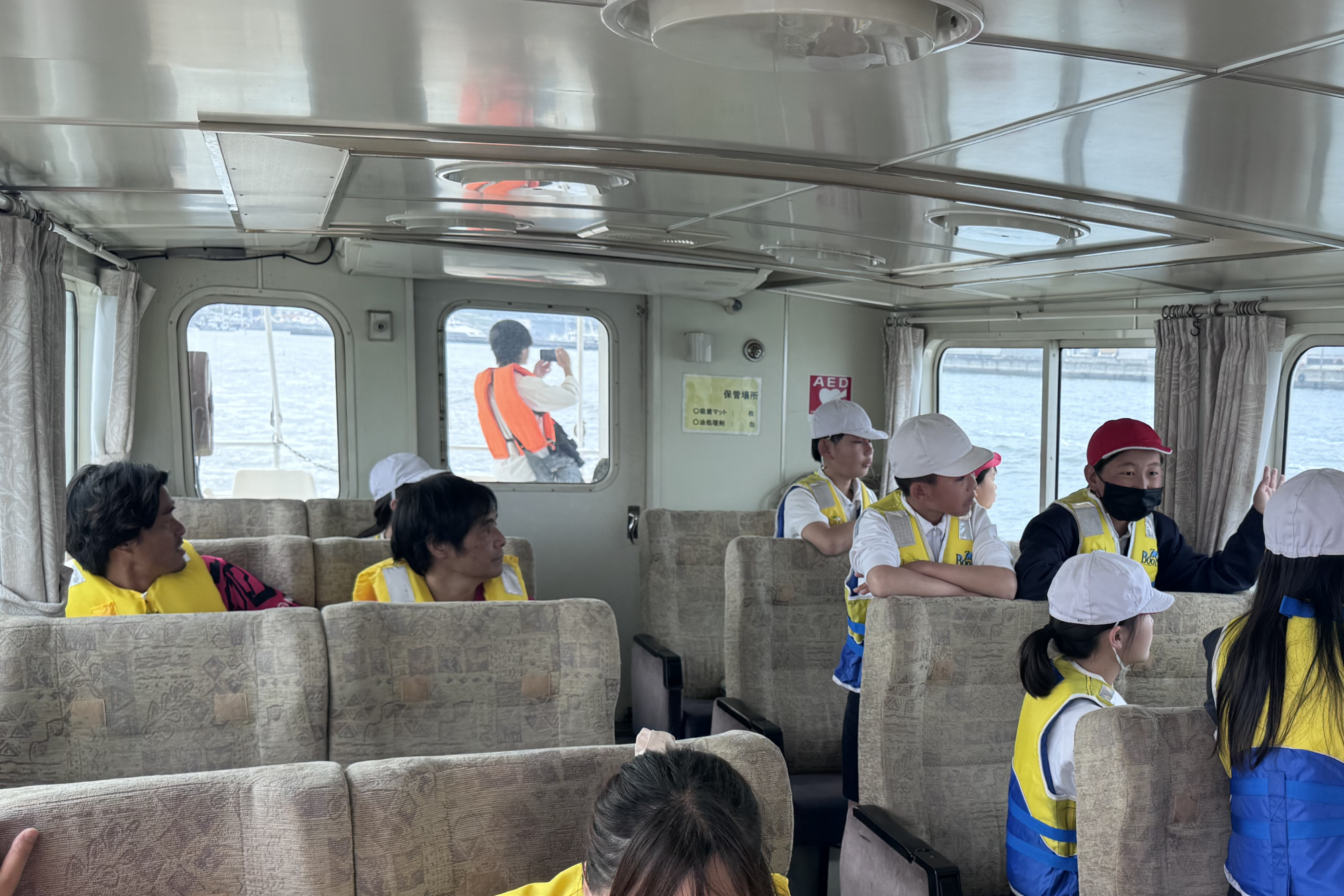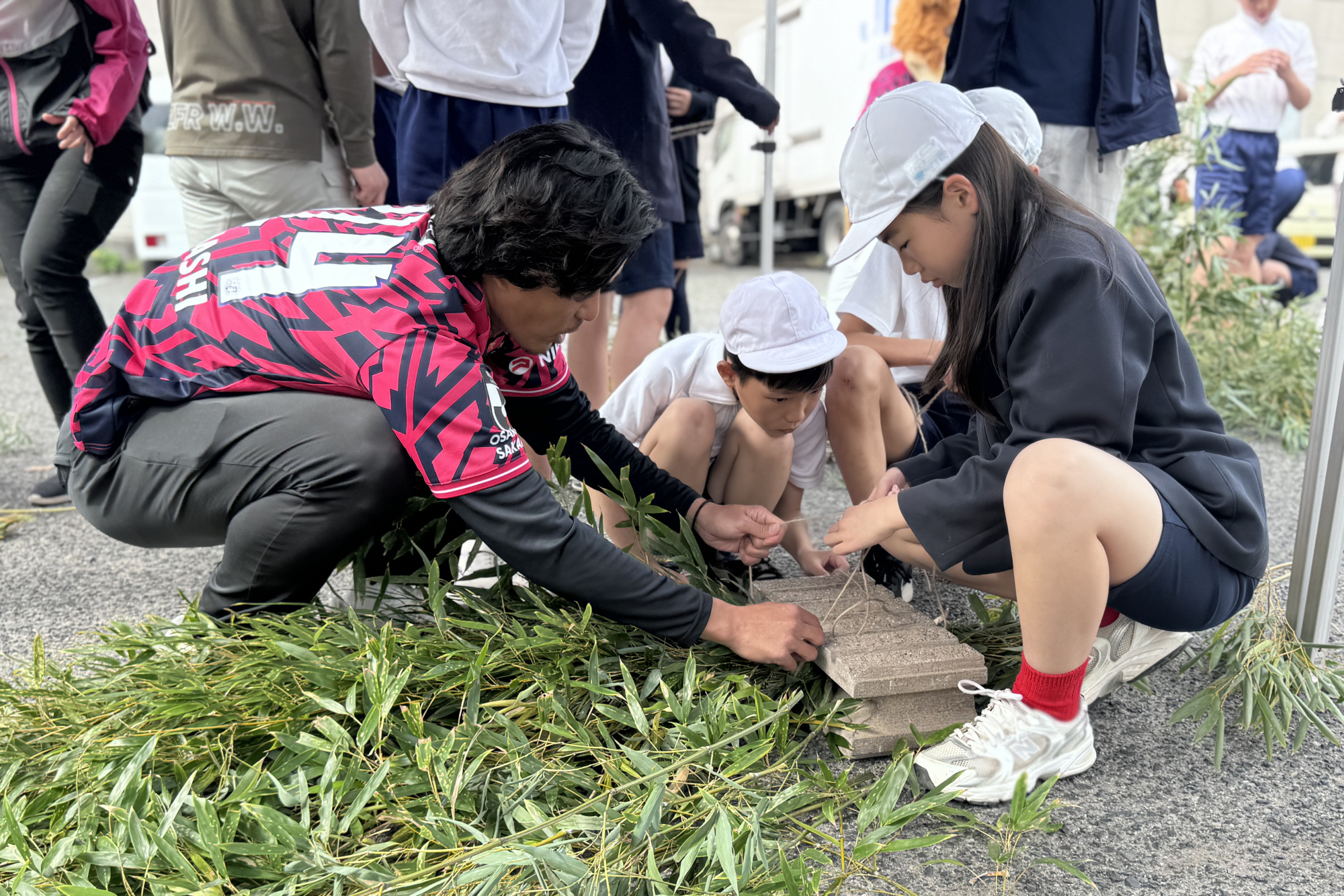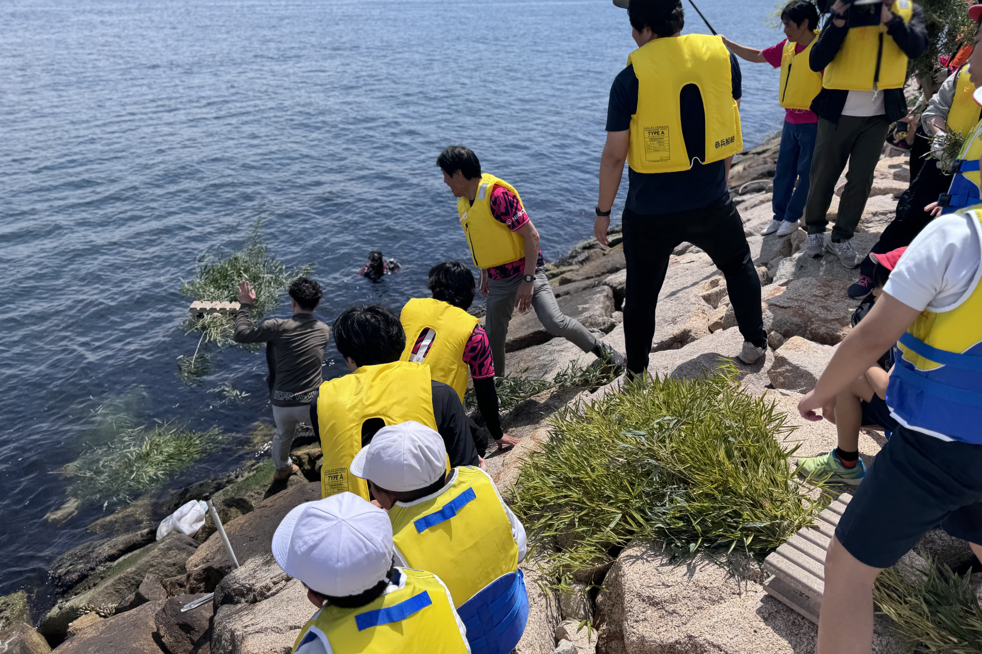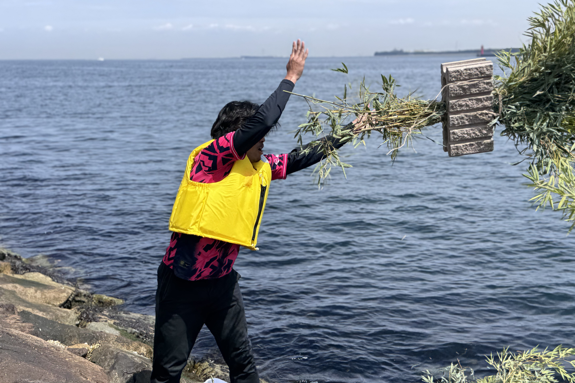 今回のフィールドワークには、修斉小学校6年生37名が参加。担当者による実演の後、グループに分かれて産卵床の制作に取り組みました。子どもたちはレンガの穴に笹を通し、両端を結ぶというシンプルながら力のいる作業に、試行錯誤しながら挑戦。初めての体験に目を輝かせ、互いに協力しながら真剣に取り組む姿が印象的でした。こうして完成した10基の産卵床は船に積み込み、沖合へ移動。約10分の航行後、担当者による投げ込みが始まると、自然と掛け声が上がり、現場は一体感に包まれました。残りの産卵床は丸橋アンバサダーが担当し、足場の不安定な中でも無事海への投げ込みを完了しました。これら10基の産卵床は地元ダイバーによって海底にて設置され、5〜6月のアオリイカの産卵を期待します。