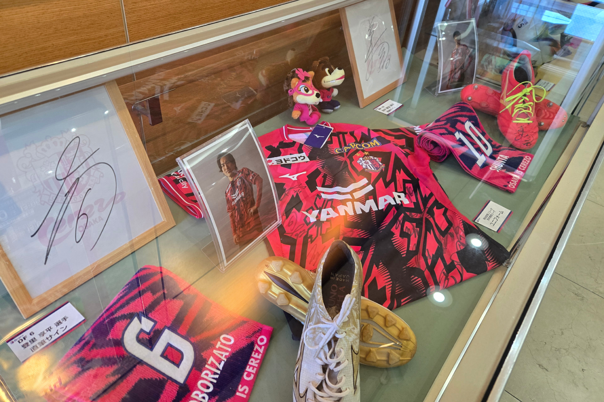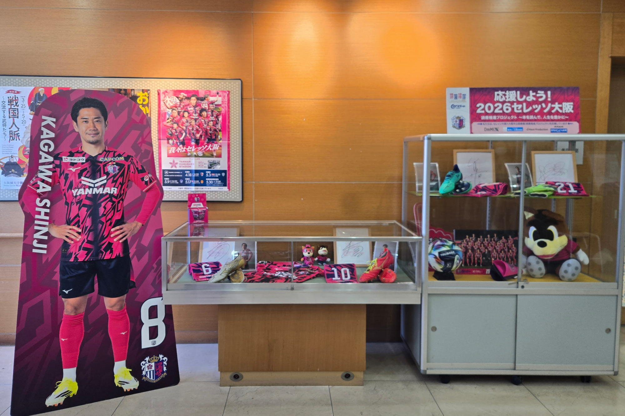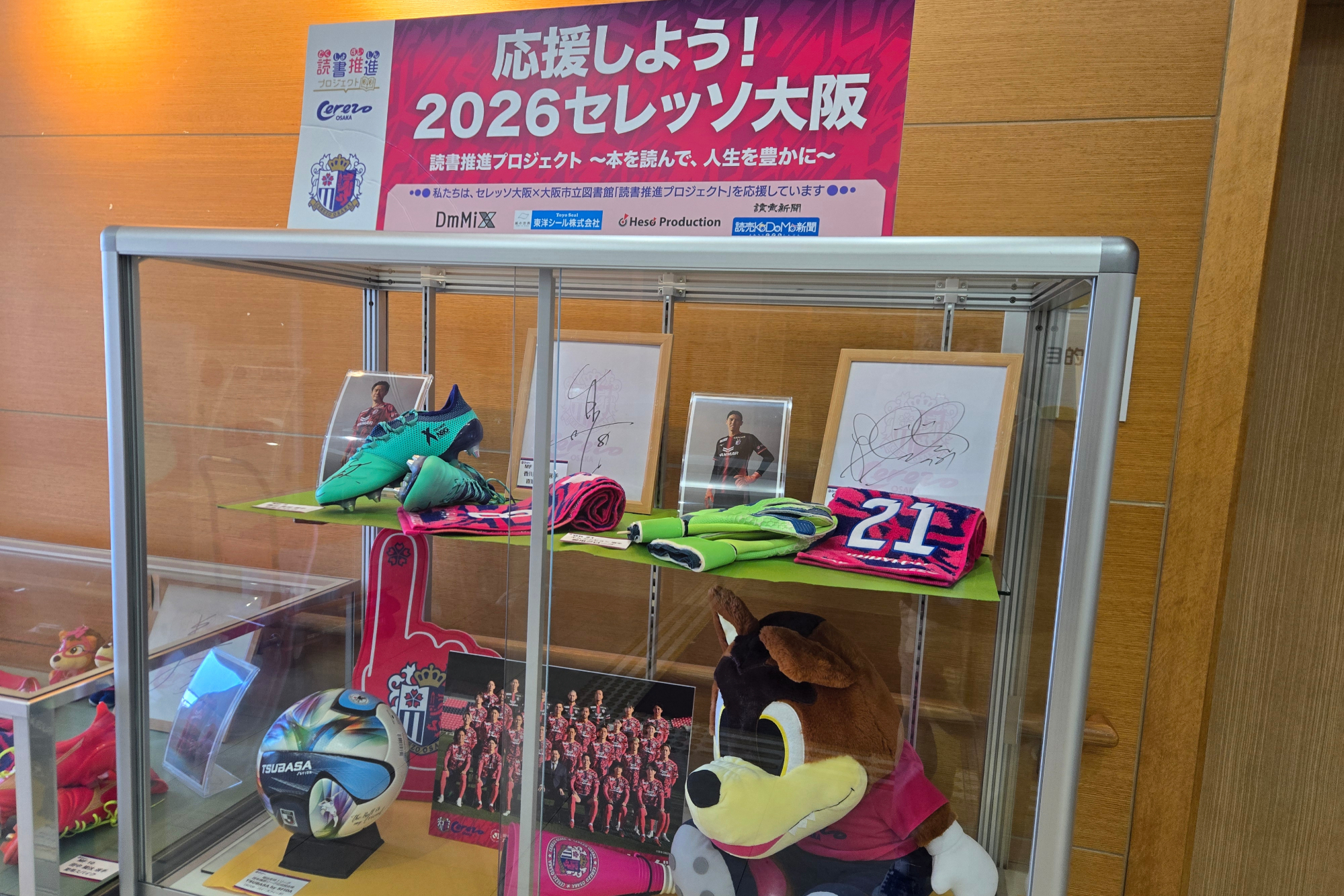 4/17(金)より、大阪市立図書館と連携して実施している読書推進プロジェクト2026の一環として、セレッソ大阪巡回展示が大阪市立東淀川図書館でスタートしています。館内では、エレベーターを降りてすぐに香川真司選手の等身大パネルがお出迎え。香川真司選手、田中駿汰選手、登里享平選手が愛用するスパイク、キム ジンヒョン選手が愛用するキーパーグローブを展示しているほか、明治安田Jリーグ百年構想リーグで実際に使用される試合球「TSUBASA J PRO」や、同リーグのユニフォーム(全選手の直筆サイン入り)もご覧いただけます。読書に親しみながら、セレッソ大阪の魅力にも触れられるこの機会に、ぜひ東淀川図書館へお越しください。