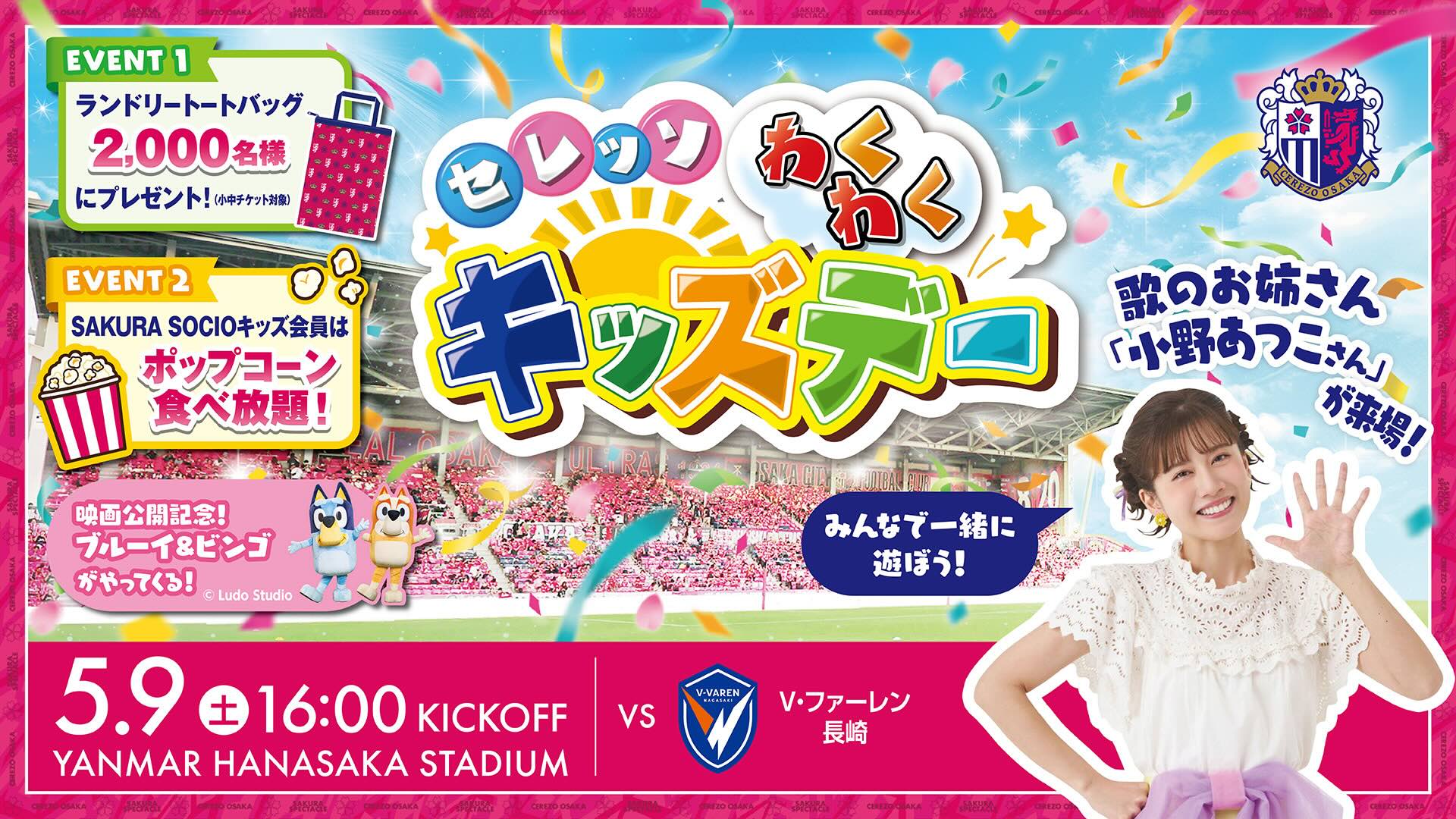 5/9(土)長崎戦でも、セレッソわくわくキッズデーを開催!この試合では、小野あつこさんにご来場いただきスタジアムを盛り上げていただきます。さらに小中チケットをお持ちの方2,000名様にランドリーバッグのプレゼントや、そのほかすべてのお子さまがお楽しみいただける1日です!是非お誘い合わせの上ご来場をお待ちしております!
