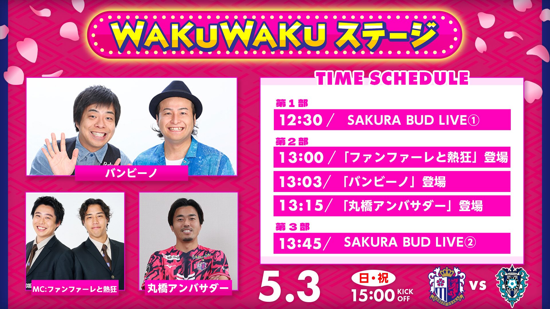 セレッソ大阪では、今シーズンも土日祝開催のホームゲームを中心に、観戦前から楽しめるコンテンツを多数ご用意。スタジアム場外でも“WAKUWAKU”を感じていただける空間をお届けします。メインMCにファンファーレと熱狂 のお二人をお招きし、ゲストとしてバンビーノのお二人、丸橋祐介アンバサダーが出演しスタジアム場外を更に盛り上げます。また、SAKURA BUD LIVEは2部構成で実施となります。